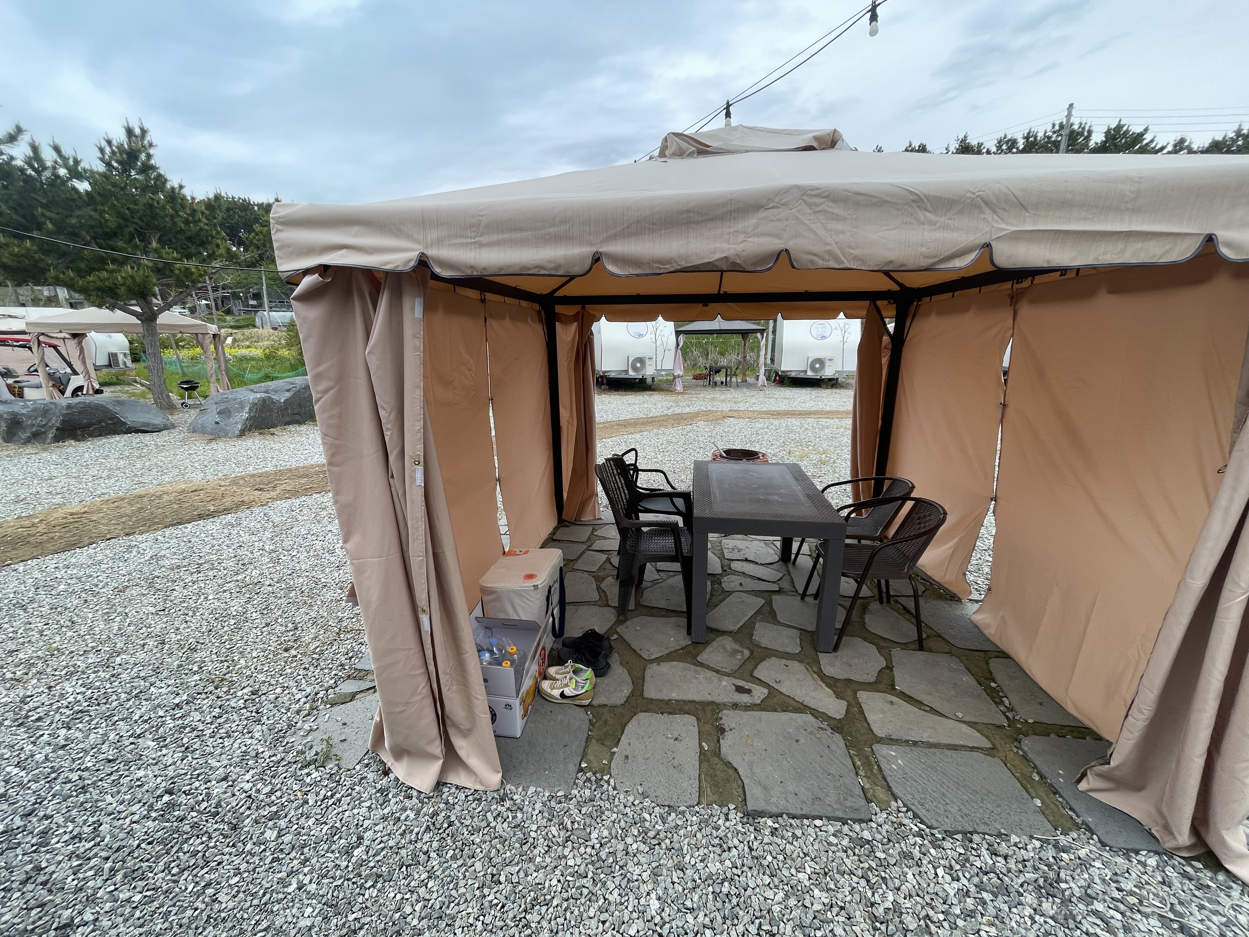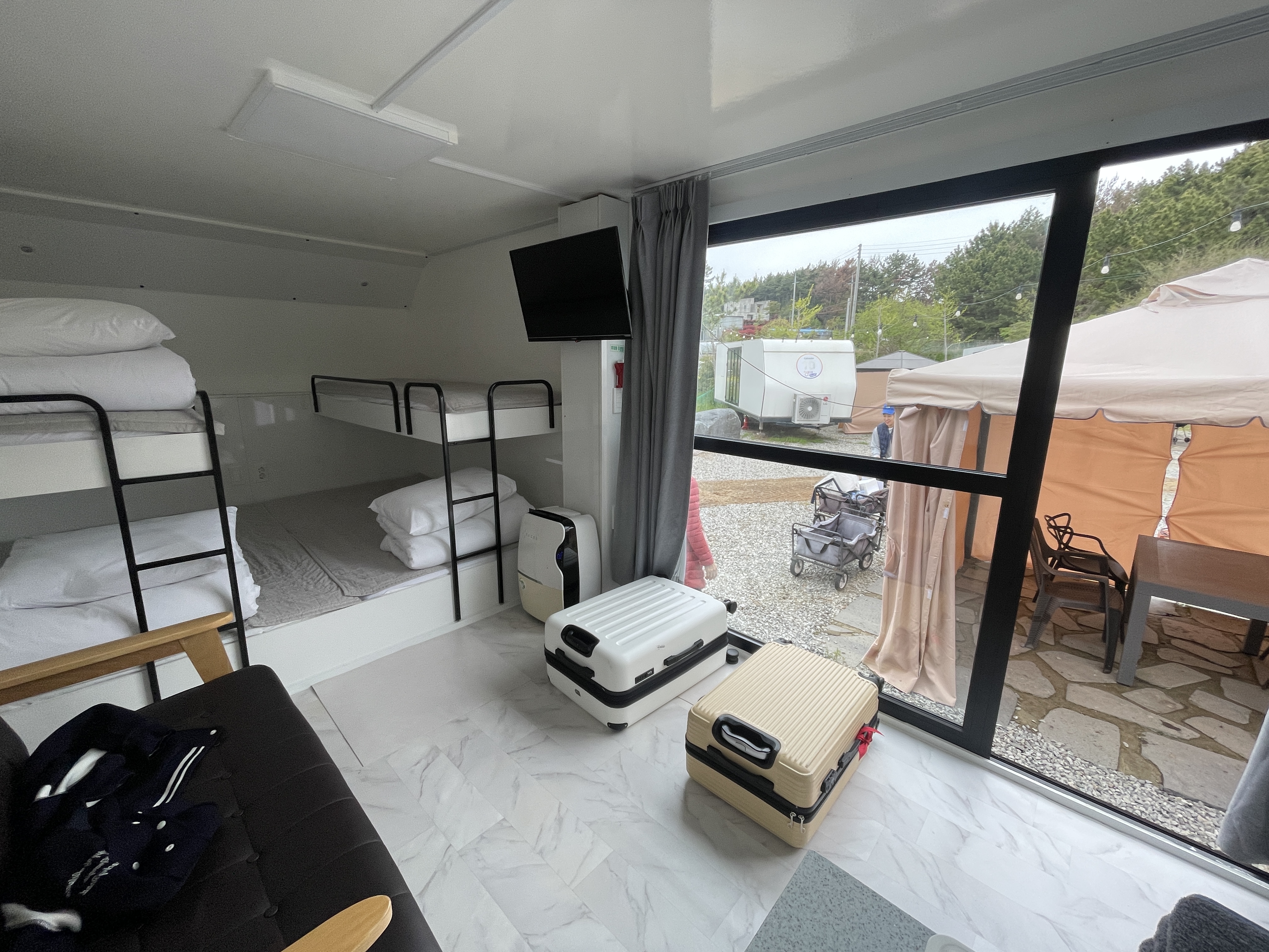 카라반 내부는 방음이 잘 되어 빗소리가 은은하게 들리는 정도였고, 아침에는 창밖을 보며 조용히 커피 한 잔을 마시기 딱 좋은 분위기가 연출됐습니다. 아이도 “비 오는 날 여기 있으니까 캠핑 느낌 제대로다”라며 무척 만족해했죠.