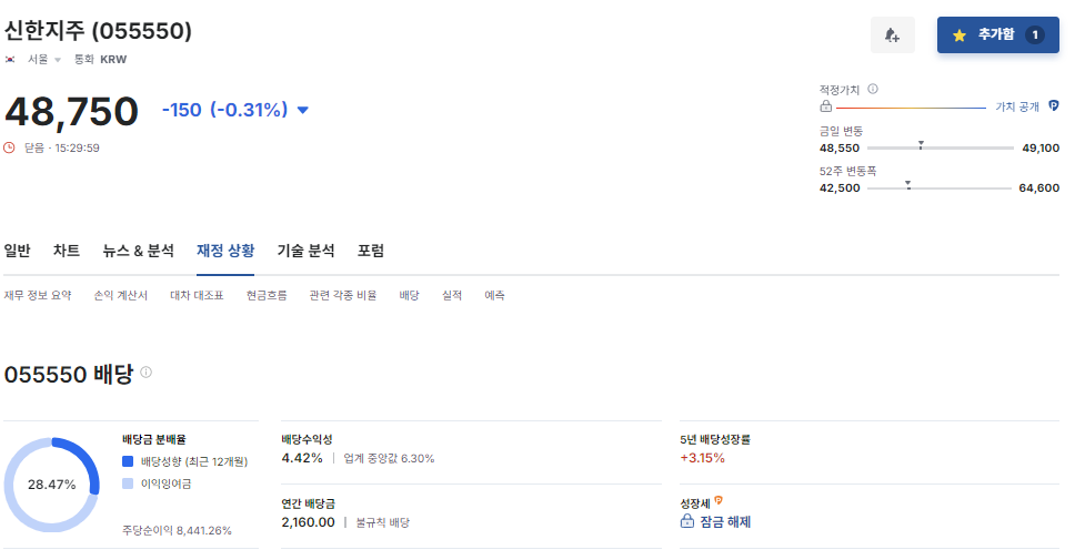 | 하나금융지주 | 45,300 | 6.4 | +8.0% | 4.6 | 0.39 | 12/31 | 매우 안정 |