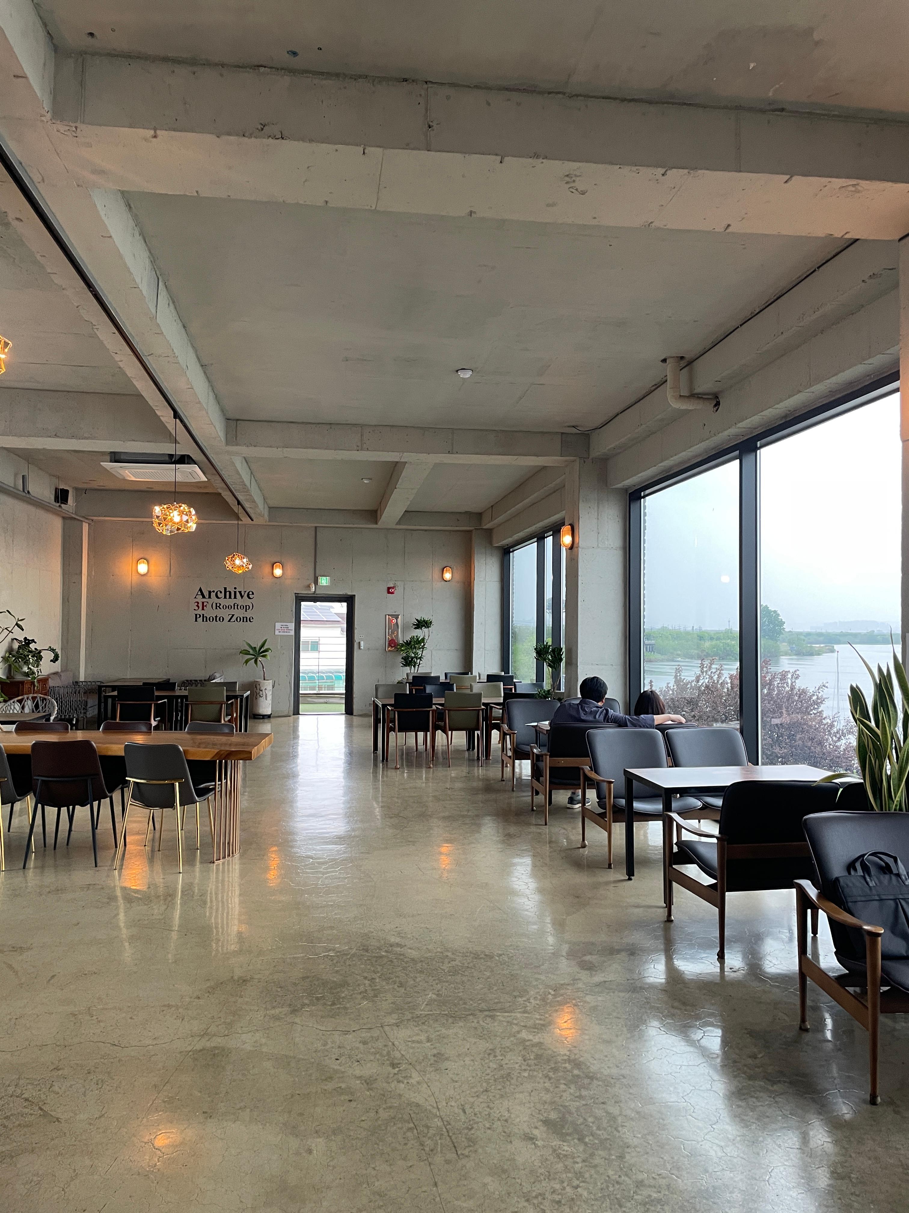 카페 아카이브는 강가 옆에 위치하고 있어, 창문 너머로 흐르는 강물과 비 내리는 풍경이 함께 어우러지면서 정말 그림 같은 풍경이 펼쳐졌습니다.
