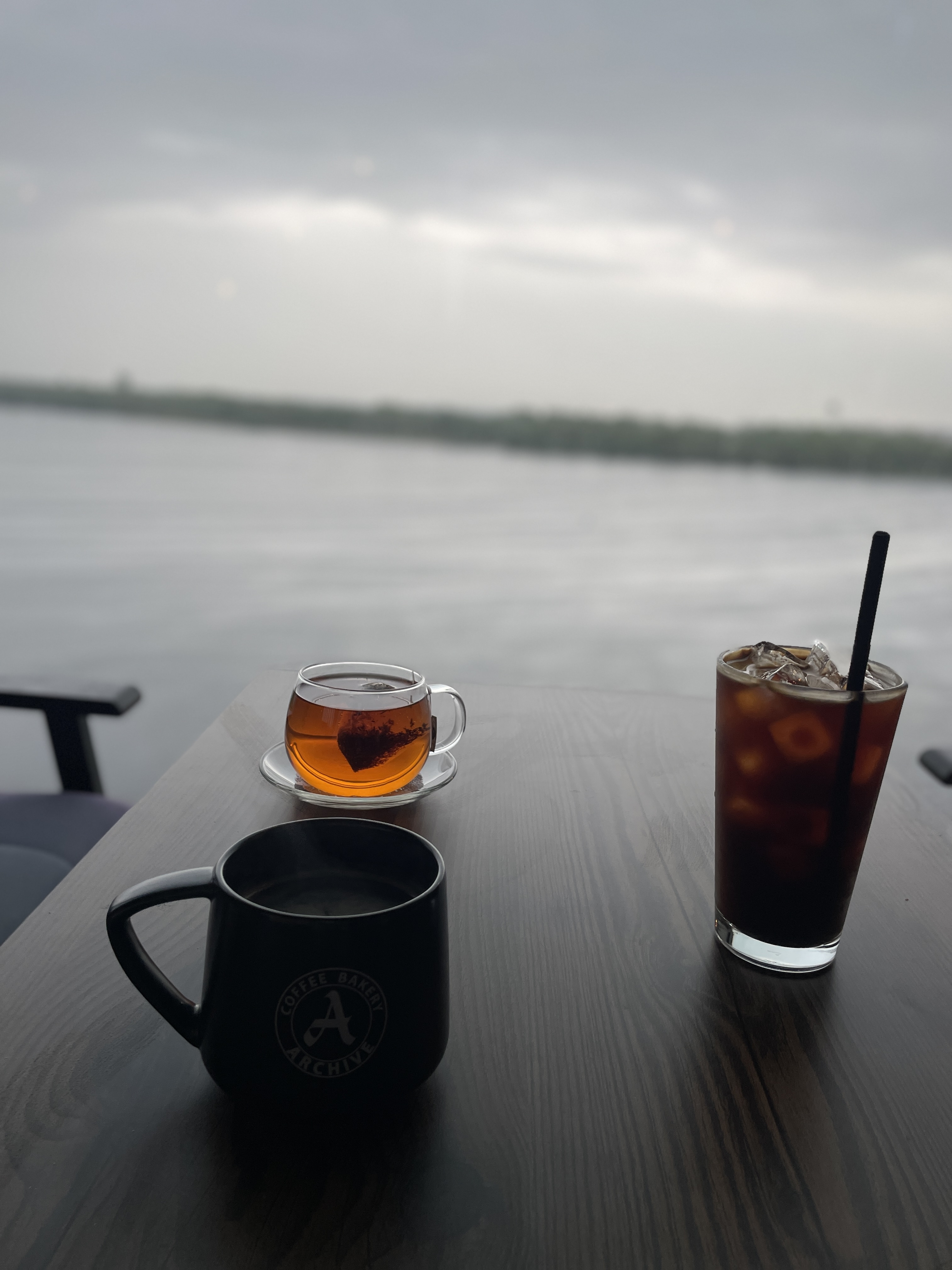 카페 아카이브는 강가 옆에 위치하고 있어, 창문 너머로 흐르는 강물과 비 내리는 풍경이 함께 어우러지면서 정말 그림 같은 풍경이 펼쳐졌습니다.