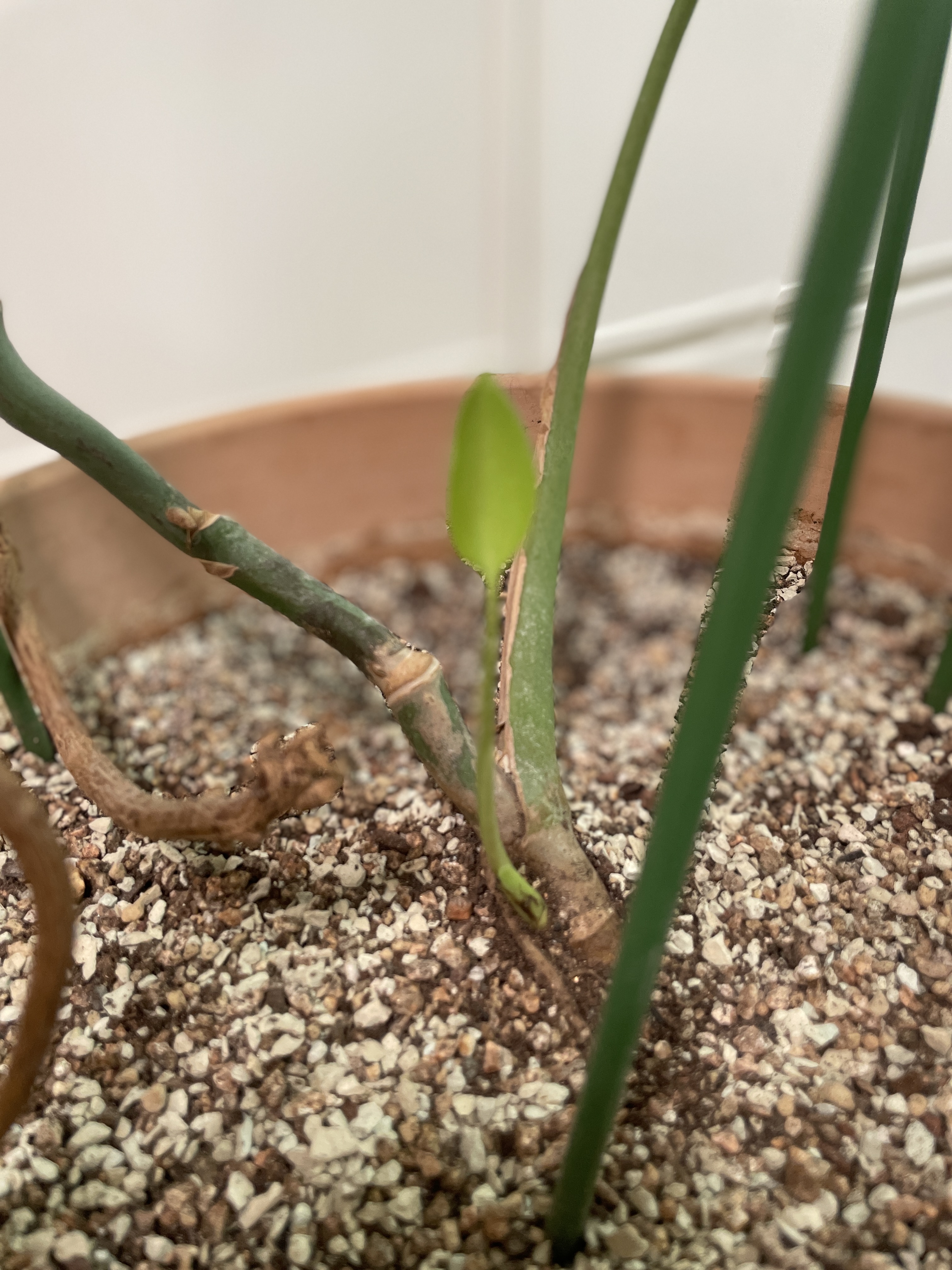 잎이 시들어가는 걸 지켜보며 속상해하던 어느 날, 뿌리 쪽을 보니 작은 새 줄기가 올라오고 있었습니다. 아직 몬스테라가 많이 큰 것도 아닌데, 기존 잎을 보내고 새로운 줄기를 키우는 모습이 정말 신기했어요.
